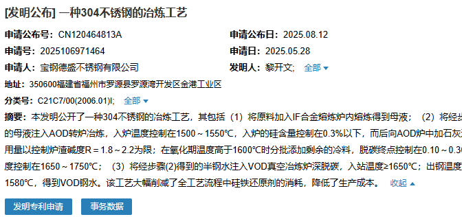 8月12日,寶鋼德盛不銹鋼有限公司成功申請(qǐng)一項(xiàng)名為“一種304不銹鋼的冶煉工藝”專利,申請(qǐng)公布號(hào)為CN120464813A,申請(qǐng)日期為2025年5月28日。