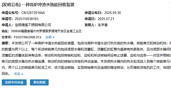 2025年9月30日,寶鋼德盛不銹鋼有限公司成功申請一項名為“一種高爐沖渣水熱能回收裝置”專利,申請公布號為CN120720184A,申請日期為2025年7月21日。