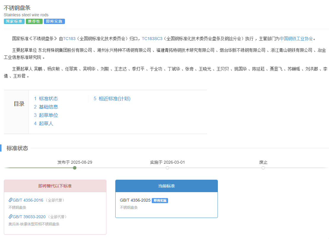 2025年8月29日,由湖州永興特種不銹鋼有限公司 、福建青拓特鋼技術(shù)研究有限公司 、煙臺華新不銹鋼有限公司 、浙江青山鋼鐵有限公司等主要單位起草的國家標準《不銹鋼盤條》 發(fā)布,將于2026年3月1日起實施。