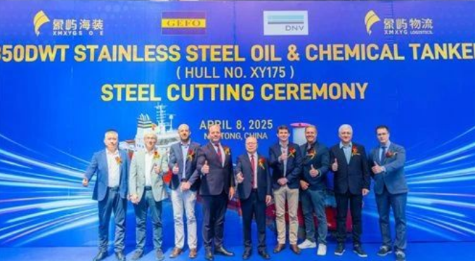 4月8日,象嶼海裝為德國GEFO集團(tuán)建造的系列3850DWT雙相不銹鋼化學(xué)品船首制船舉行開工儀式。GEFO集團(tuán)技術(shù)總監(jiān)Henning Brauer,DNV船級(jí)社南通分公司總經(jīng)理葛宜龍,象嶼海裝營(yíng)銷總監(jiān)楊俊生等一起見證項(xiàng)目開工,首制船鋼板切割。
